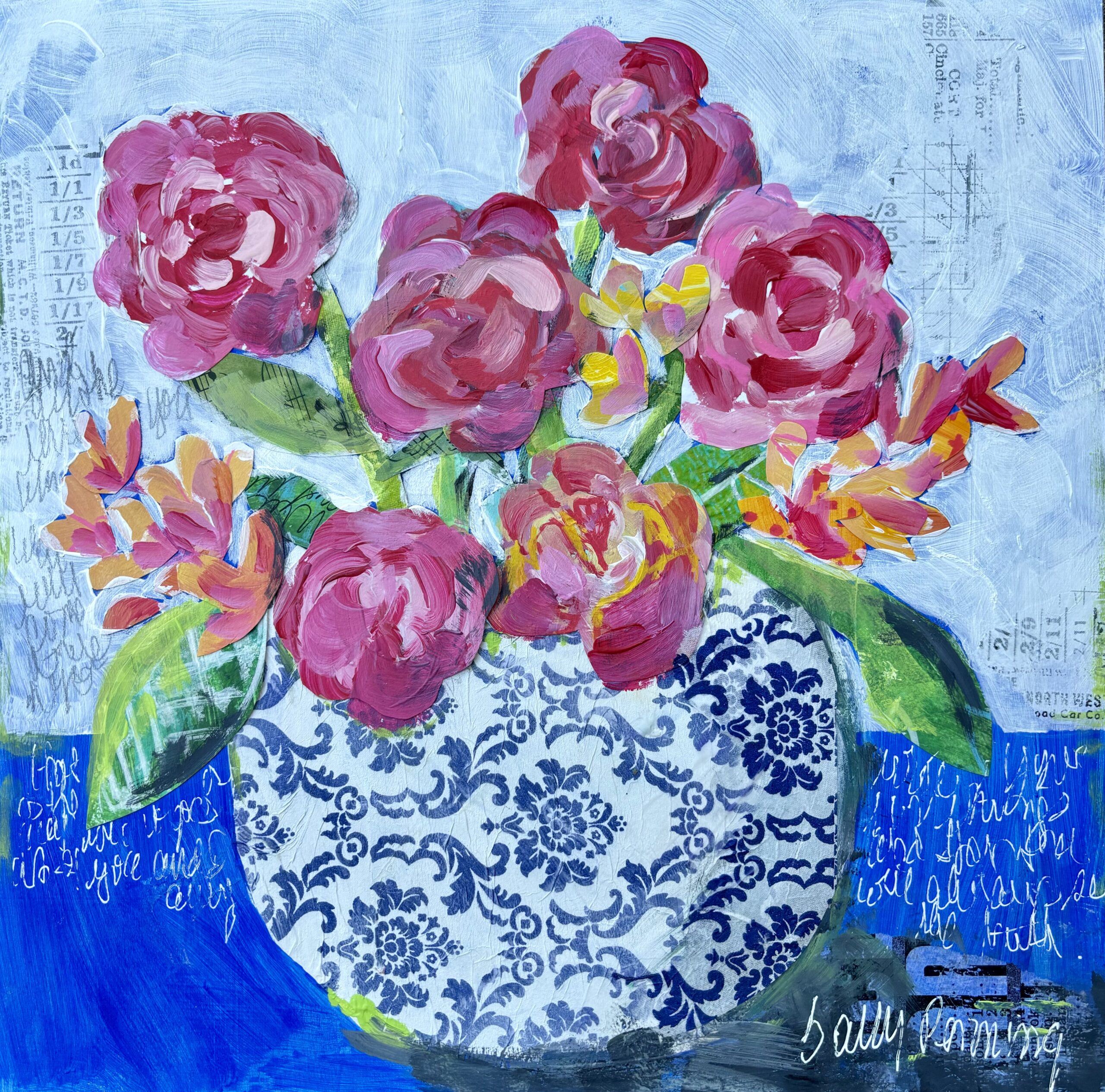 floral mixed media on a board with blue/white decoupage vase